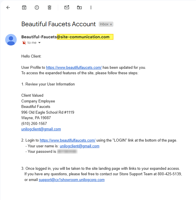 After your user profile is created, you will receive a User Update email from an "@site-communication.com" email address. Ensure you check your spam or junk folder if you do not see it in your inbox. If you still do not receive it, contact your support team.